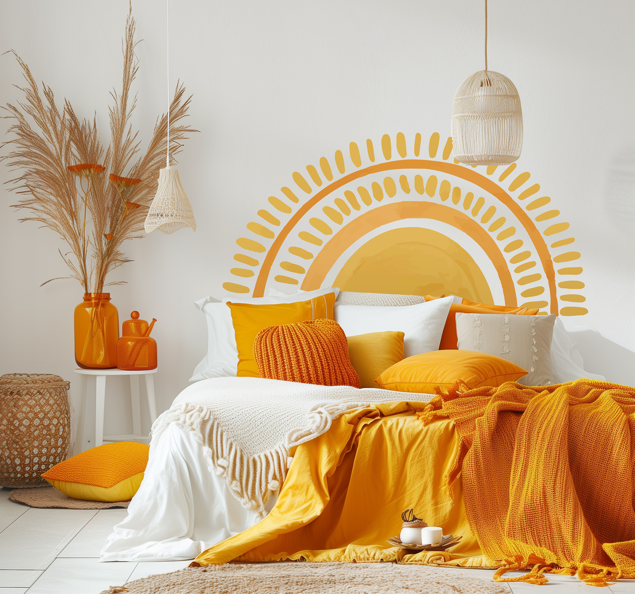 Het ontwerp van deze getekende gele zon slaapkamer muursticker is een ware blikvanger! Met een stralende zon in een prachtige gele en oranje kleur, zal deze muursticker een warme en vrolijke sfeer toevoegen aan elke slaapkamer. De halve cirkelvorm maakt het perfect voor plaatsing boven het hoofdeinde van het bed, waardoor het een natuurlijke uitstraling krijgt.
