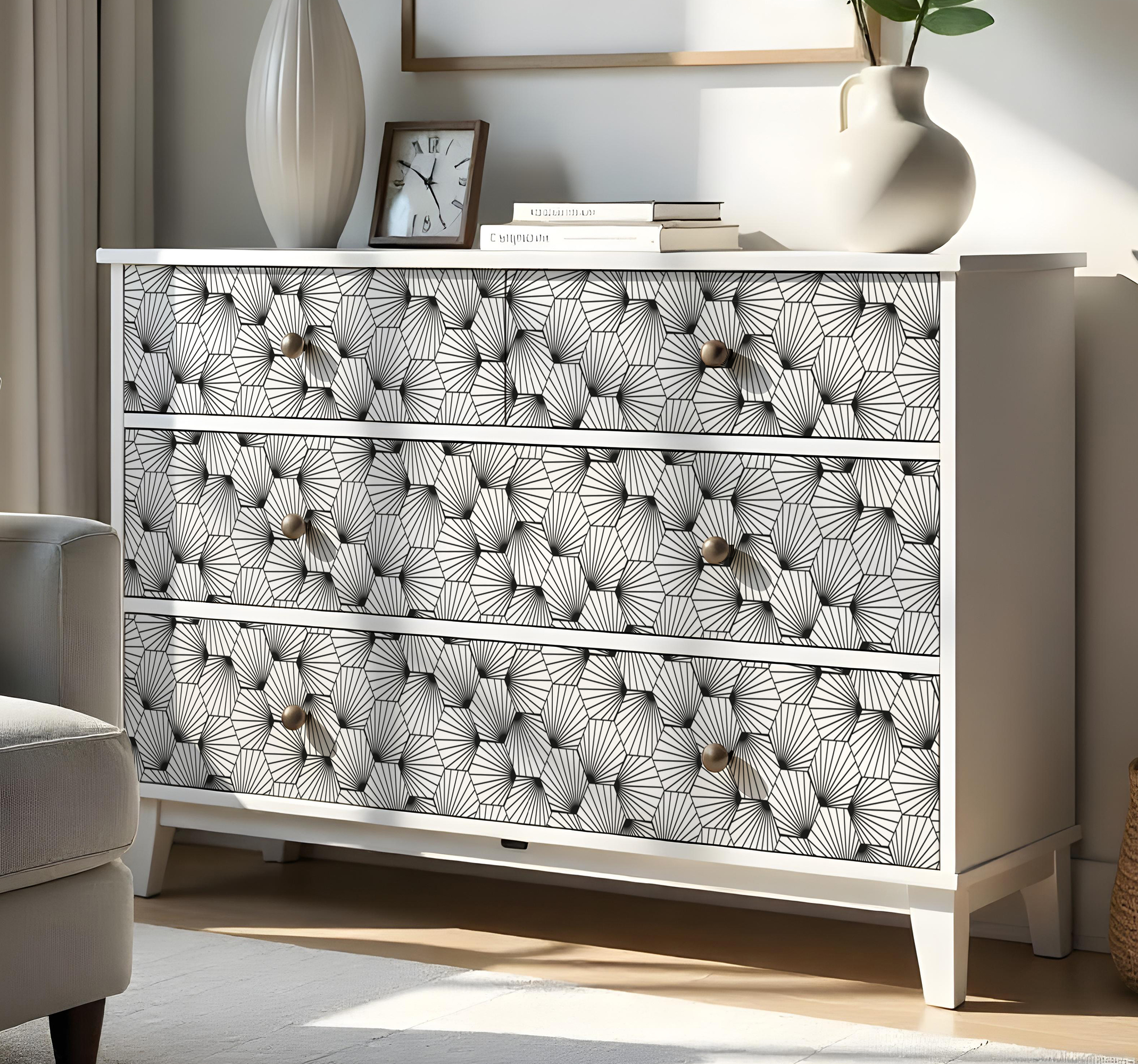 Breng een vleugje stijl en elegantie in uw interieur met onze Hexagonaal patroon met lijnen meubel sticker. Dit prachtige ontwerp, dat bestaat uit zeshoeken en lijnen in een tijdloos zwart-wit contrast, voegt een grafisch accent toe aan elke ruimte. De strakke lijnen en het geometrische patroon creëren een moderne uitstraling die perfect past in zowel eigentijdse als klassieke interieurs.