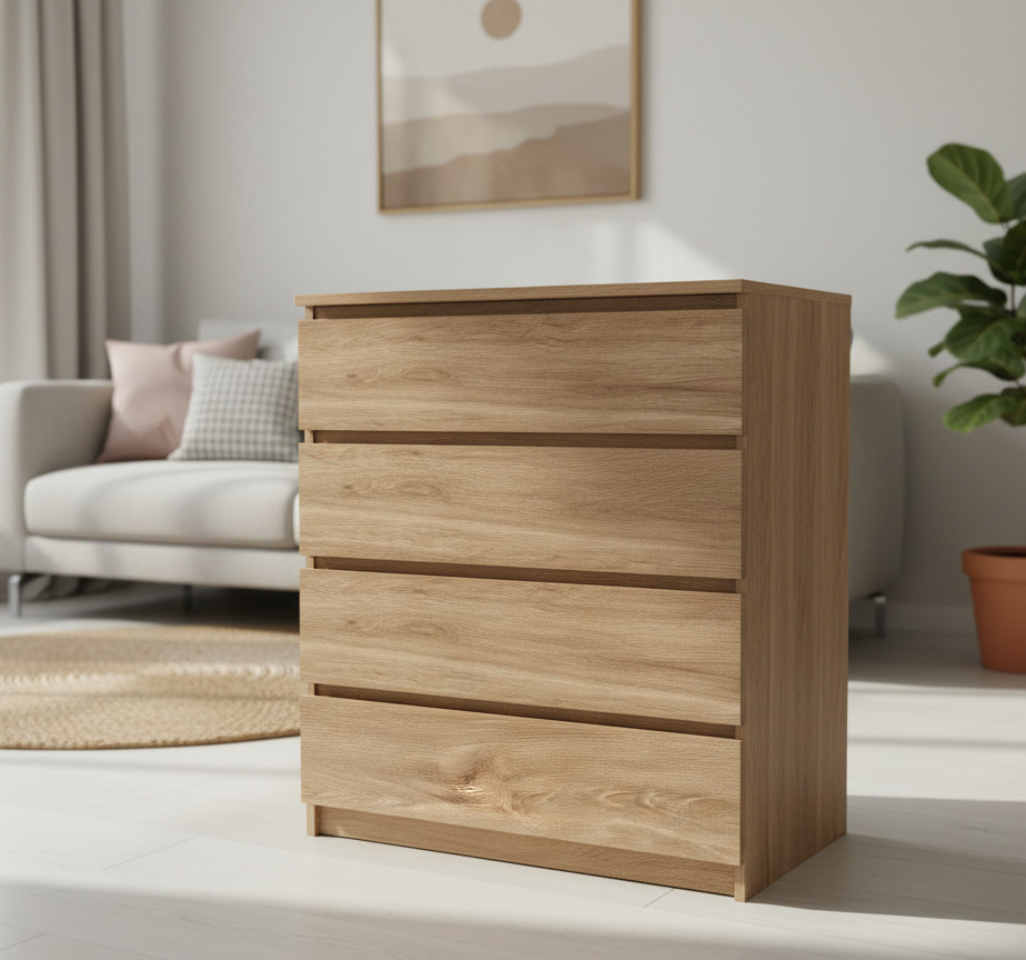 Een stijlvolle meubelstuk met vier ruime lades, perfect voor het organiseren van uw bezittingen. De natuurlijke houtafwerking voegt warmte en verfijning toe aan elke kamer. Dit ontwerp combineert moeiteloos functionaliteit met elegantie, waardoor het een geweldige aanvulling is op moderne interieurs.
