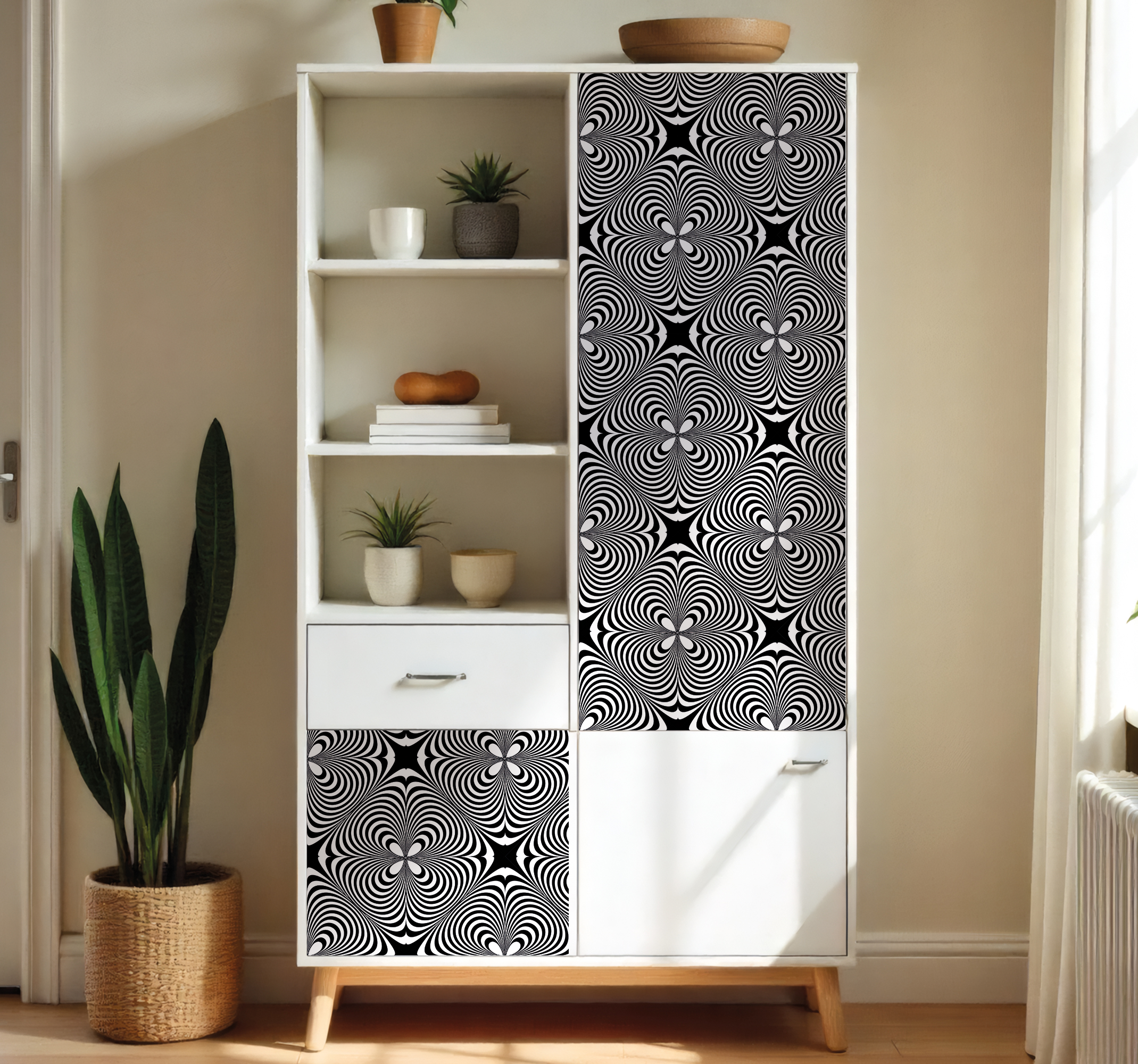 Breng een vleugje verfijning en creativiteit in uw interieur met onze Meubel sticker zwart-wit trompe l’oeil. Dit unieke ontwerp speelt met de illusie van diepte, waarbij abstracte vormen in een stijlvolle zwart-witte combinatie samenkomen. Het resultaat is een visueel spektakel dat niet alleen de aandacht trekt maar ook een moderne en elegante sfeer creëert in elke ruimte.