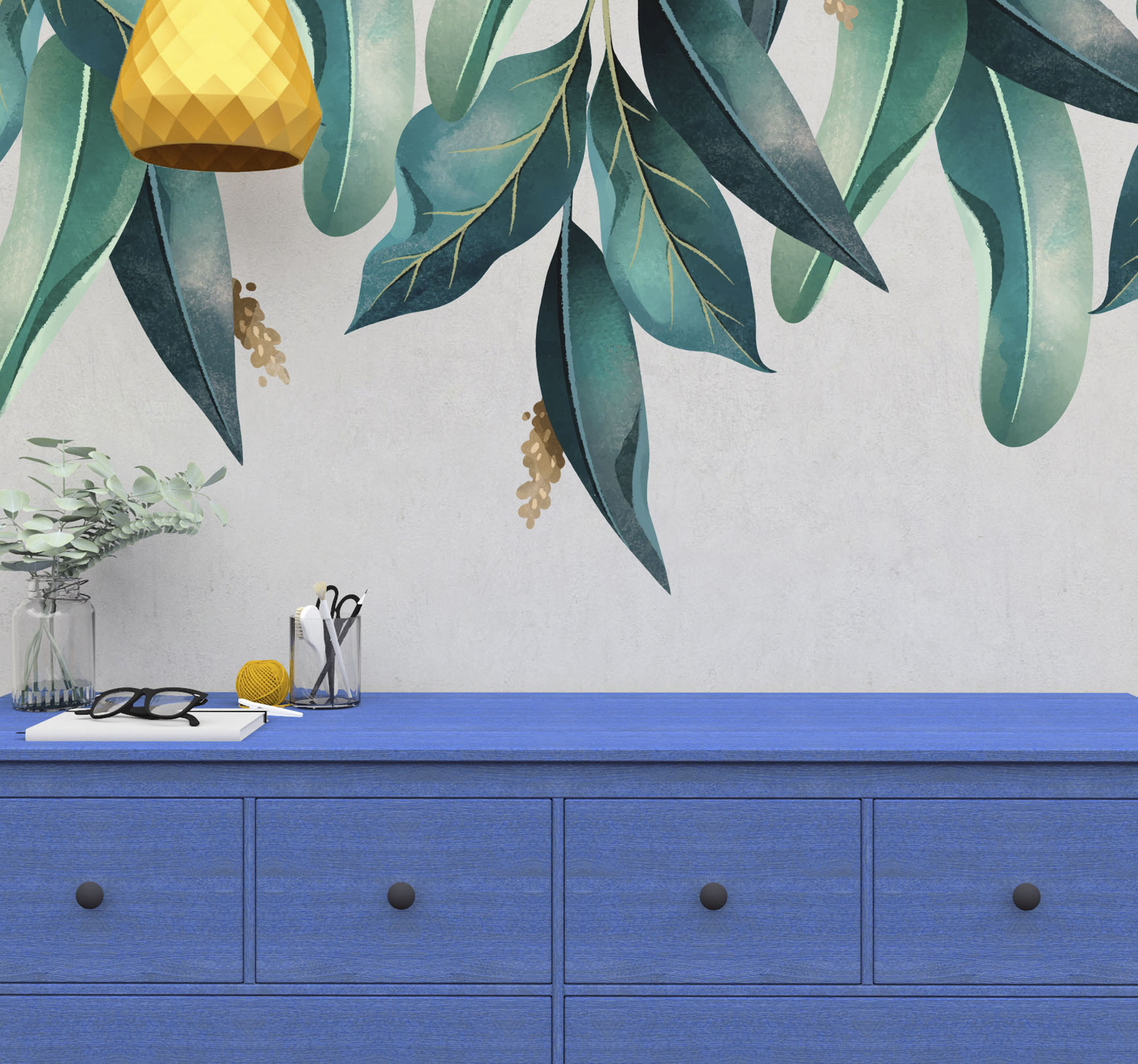 Een realistisch uitziende hangende tropische bladeren plant muursticker