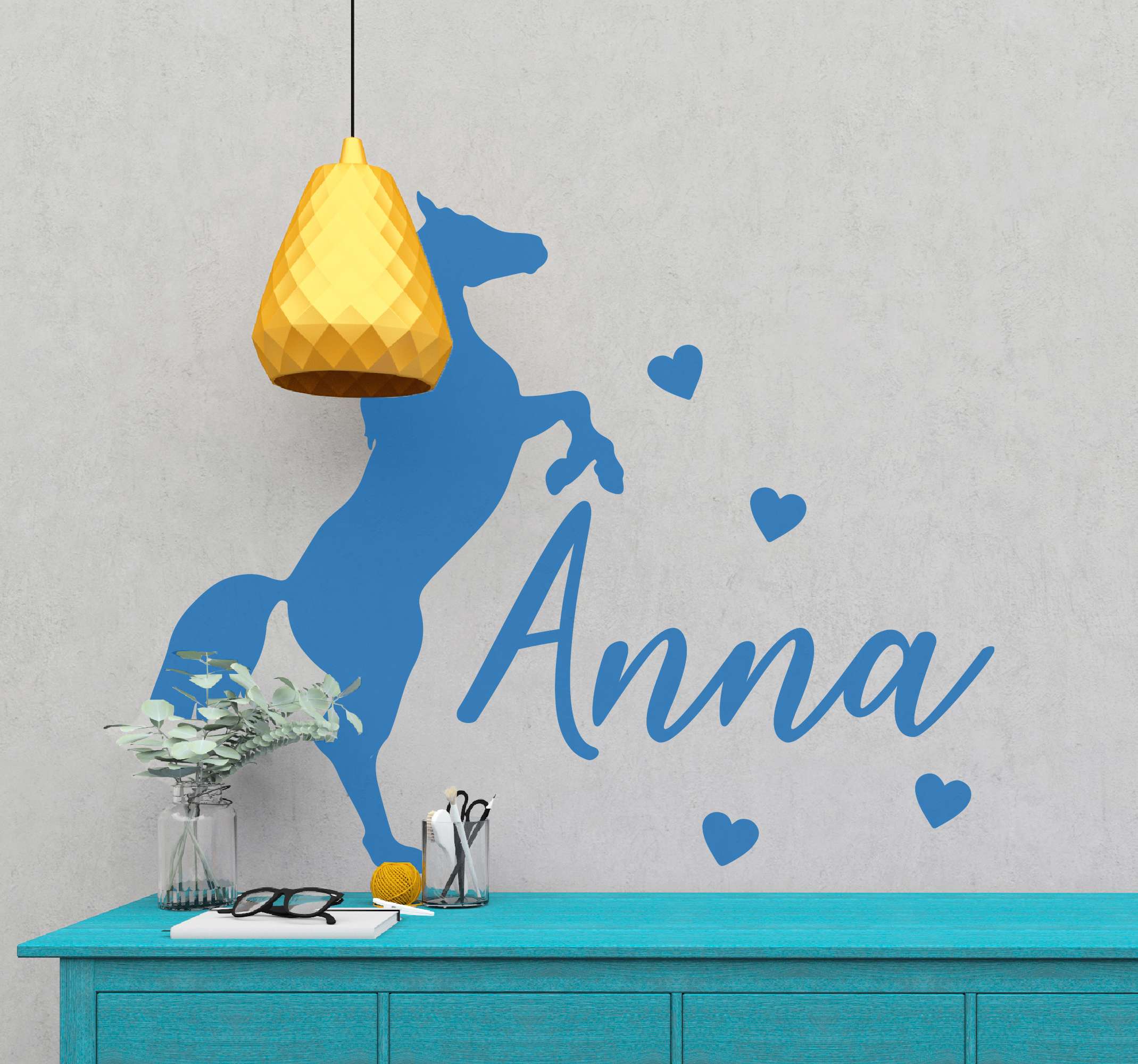 Als u een liefhebber bent van paarden, boerderijdieren of dieren in het algemeen, dan raden wij bij tenstickers deze hoogwaardige en duurzame gepersonaliseerde muursticker van een rijzend paard met gepersonaliseerde naam aan. Dit prachtige ontwerp zal niet alleen geweldig staan op de muren van uw huis, maar kan ook dienen als een persoonlijk cadeau voor uw kind. Het stijgende paard met hartjes eromheen en uw eigen naam onder het paard maken deze muursticker extra bijzonder. Bestel nu en geef uw interieur een persoonlijk tintje!
