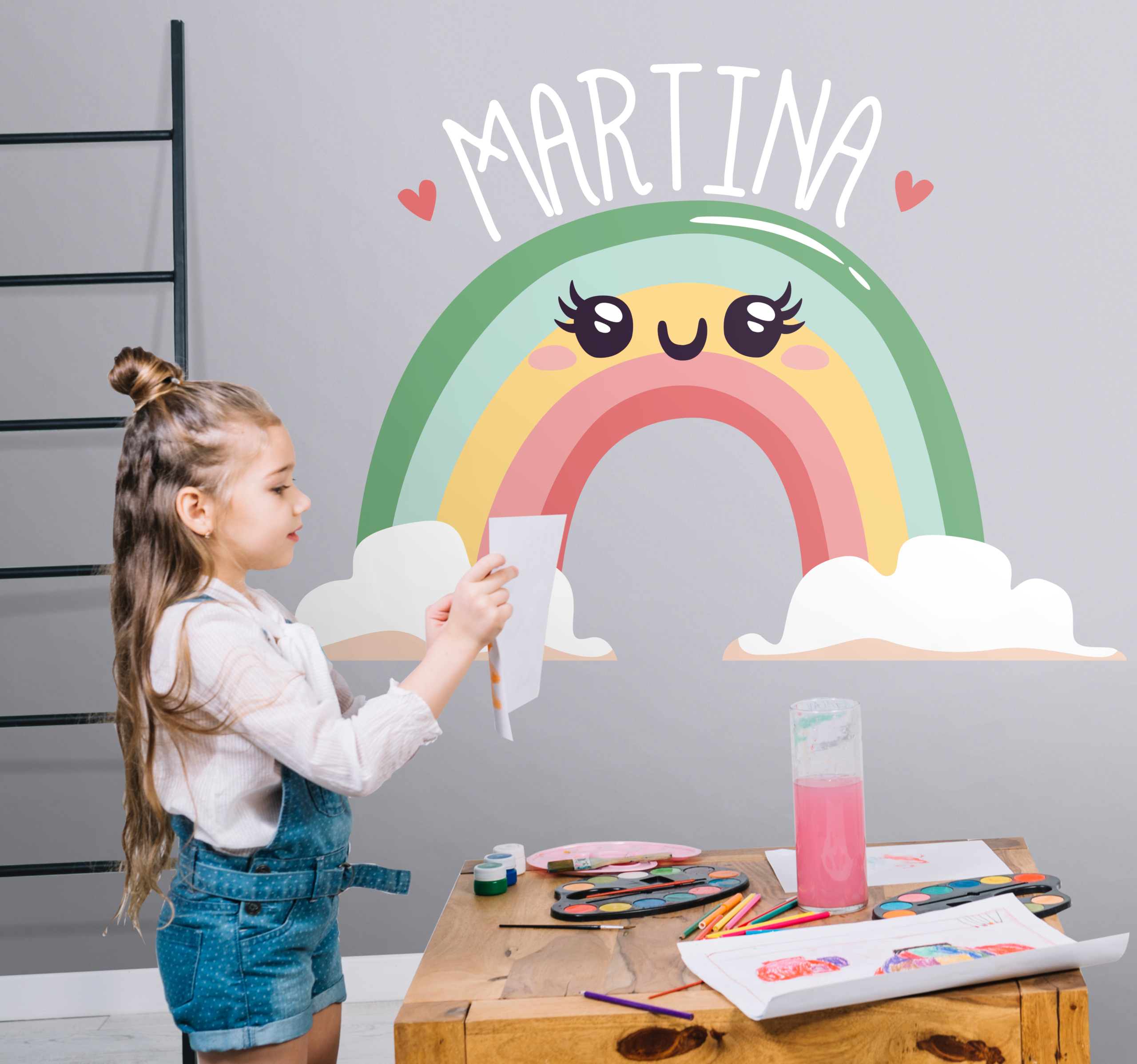 Leuke regenboog met wolken met naamsticker voor kinderruimte. Het zal een fantastische uitstraling geven aan de ruimte van kinderen en het kan worden aangepast met de naam van uw keuze. Voer de naam in die erop moet worden gepersonaliseerd in het tekstveld en het zal bij uw bestelling worden gemaakt. Het vervaagt niet, geen kreuken of bubbel effect wanneer het wordt aangebracht. Kies de maat die bij u past en plaats de bestelling ervoor.