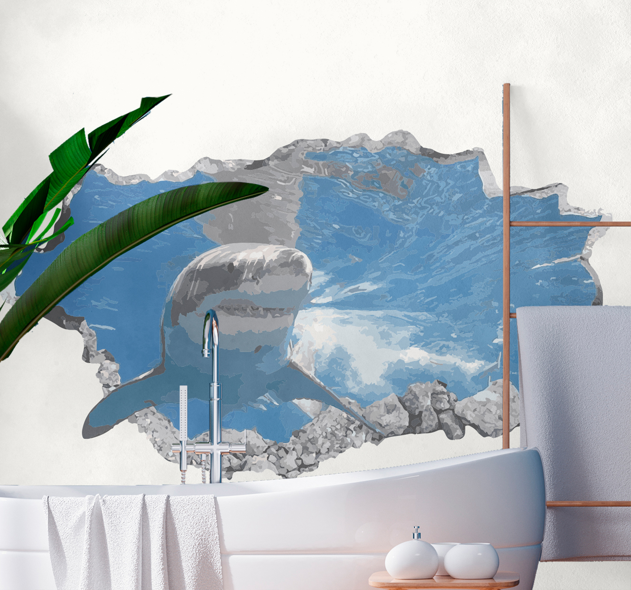 Een verbazingwekkende realistische muursticker met visueel effect die een grote haai illustreert die een muur doorkruist vanuit de diepblauwe zee. Dit originele en mooie realistische ontwerp van het embleem van de haai vissen zou uw ruimte versieren met een mooie attractie die u zeker zou bewonderen. Uw gasent zullen blij zijn met uw decoratie. Het aanbrengen is niet moeilijk, u heeft alleen een rakel nodig om het soepel op de muur te bevestigen.